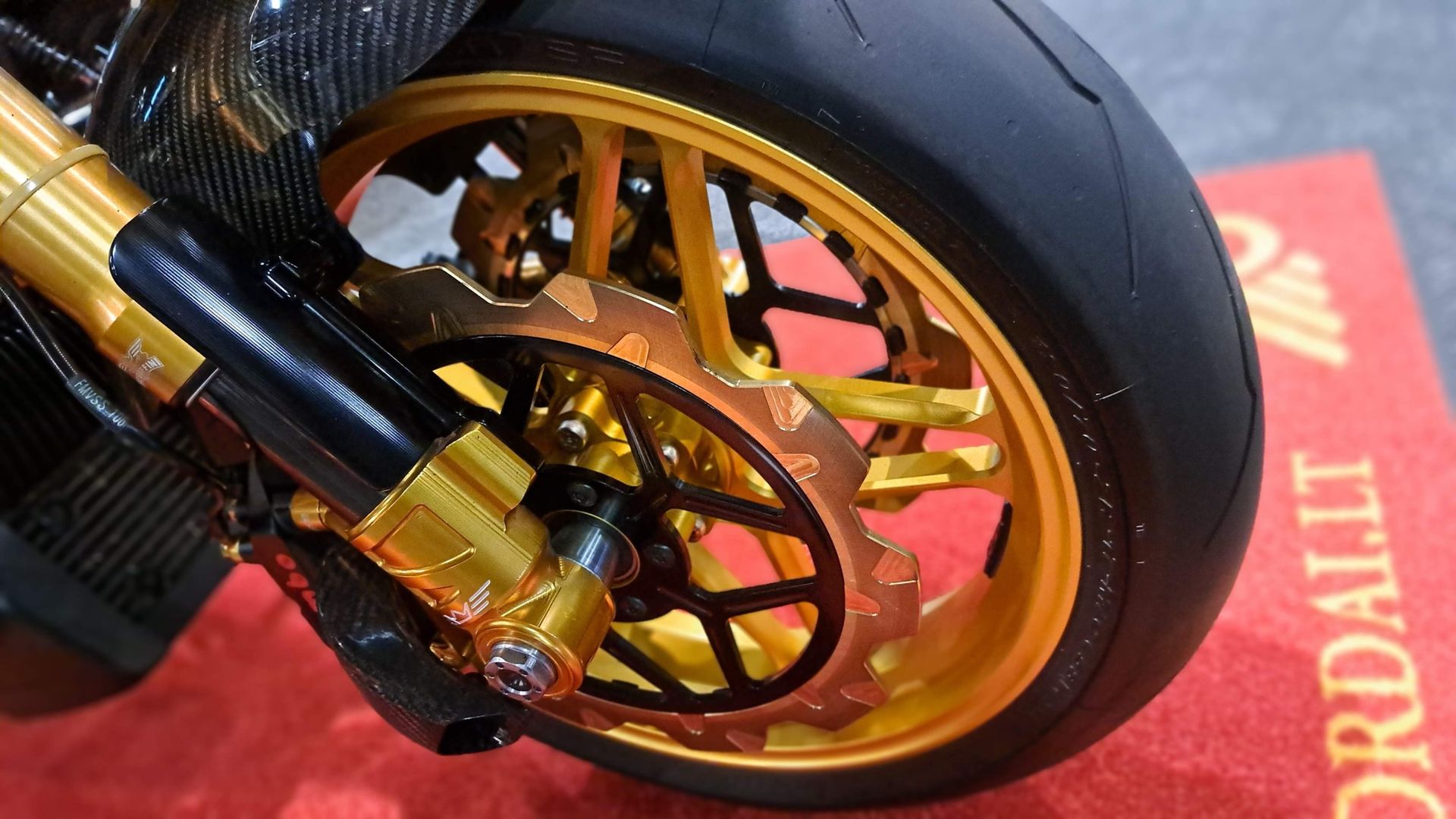 Nice combination of golden front fork, wheels and brake discs.