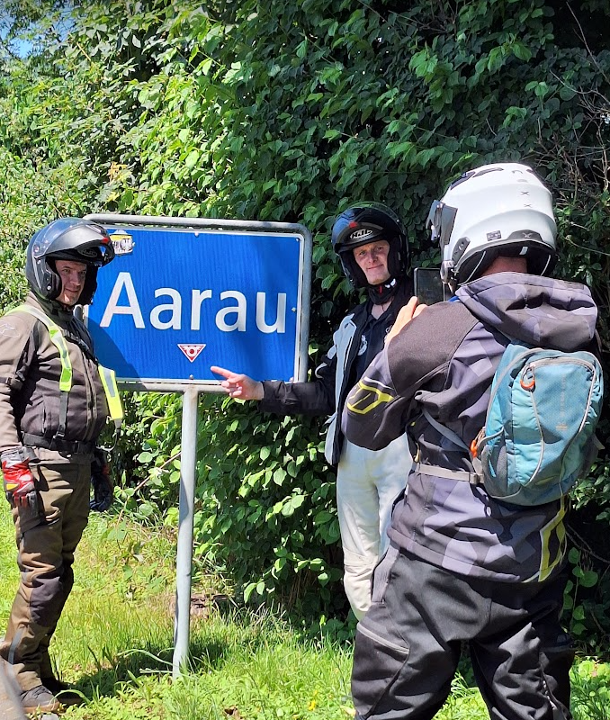 In Aarau – Our furthest point from home this vacation – we had to take a moment to put a sticker on the town sign and take a picture of it. 2 of our mates were taking part in a competition of their local motorcycle club, who is the furthest from home.