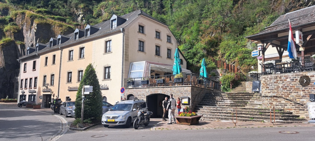 Around 17:15 we arrived at the hotel in Esch-sur-Sûre, Luxembourg, where we reunited with the rest of the pack. Here we took the keys, put the bikes in the garage, tuned up another one of the bikes a bit, and went to the rooms to freshen up.