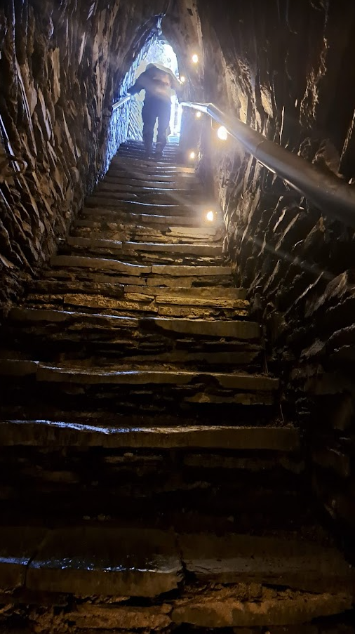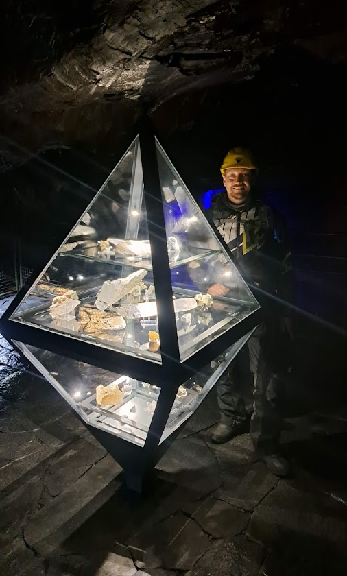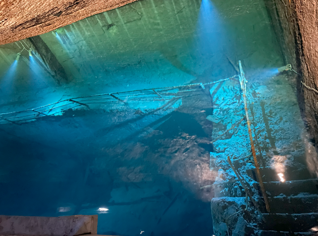 Through narrow staircases and corridors, we entered different underground chambers, where video projected on the walls showed all kinds of footage of how people used to work in the mines. At its deepest point, the mine was 168 meters deep. Of this, the last 100 meters were dug in the last 50 years of production. We could get to a depth of 42 meters, although the water table was only 12 meters deep. So the mines were constantly being pumped out, to a depth of 42 meters. Everything below was under clear water, allowing us to see far below the surface what the situation there used to be.