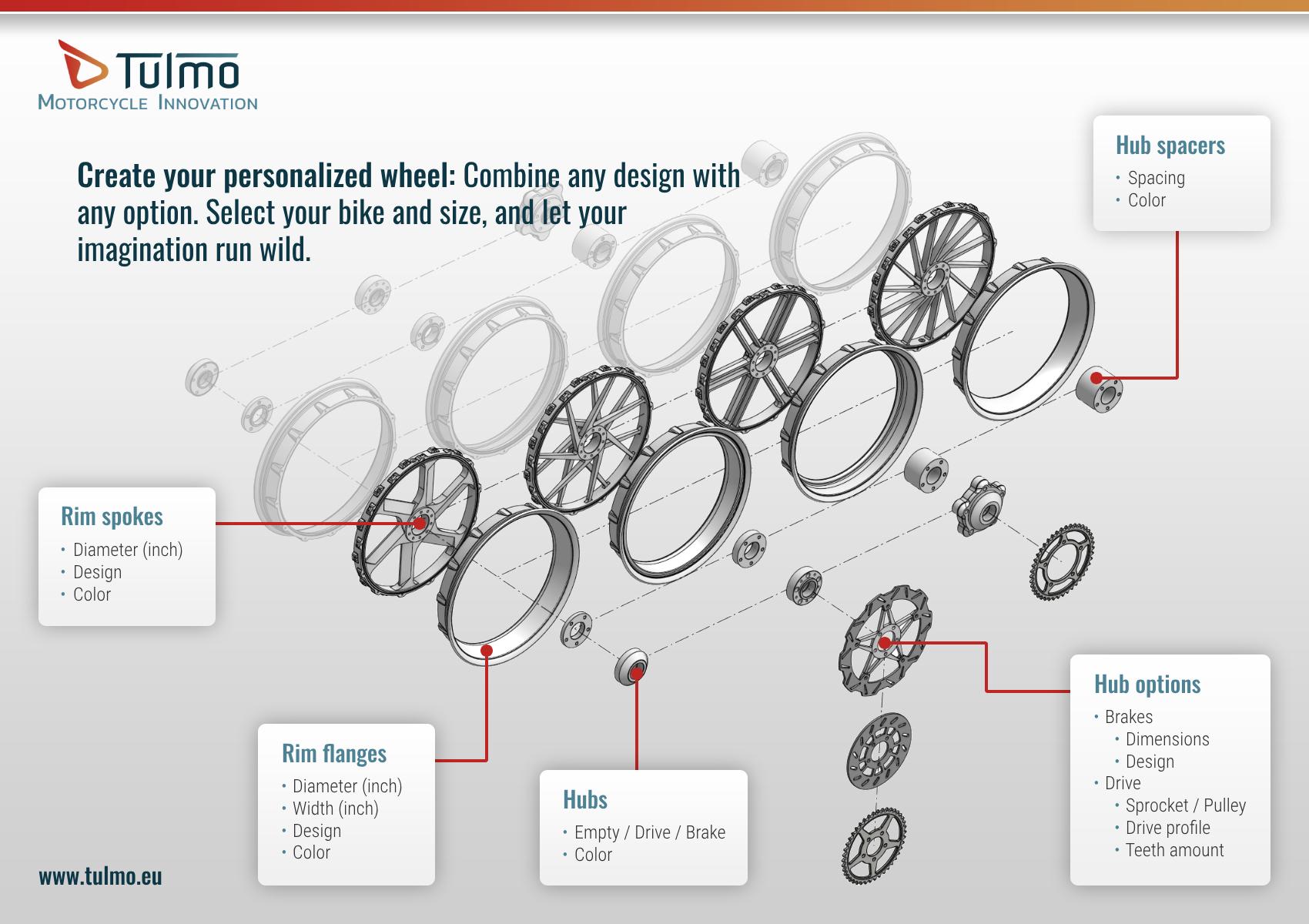 Then you can play with the different models, colors and options. We design the components so that each model can be used for each size. Also, the basis of all components is the same, so each model can be combined with each other. Rim spoke 'A' can be combined with rim flange 'B' or rim flange 'C'. You can even use a different flange on the left side than on the right side. Each part can also be colored separately. So you can make a unicorn or a rainbow rim!